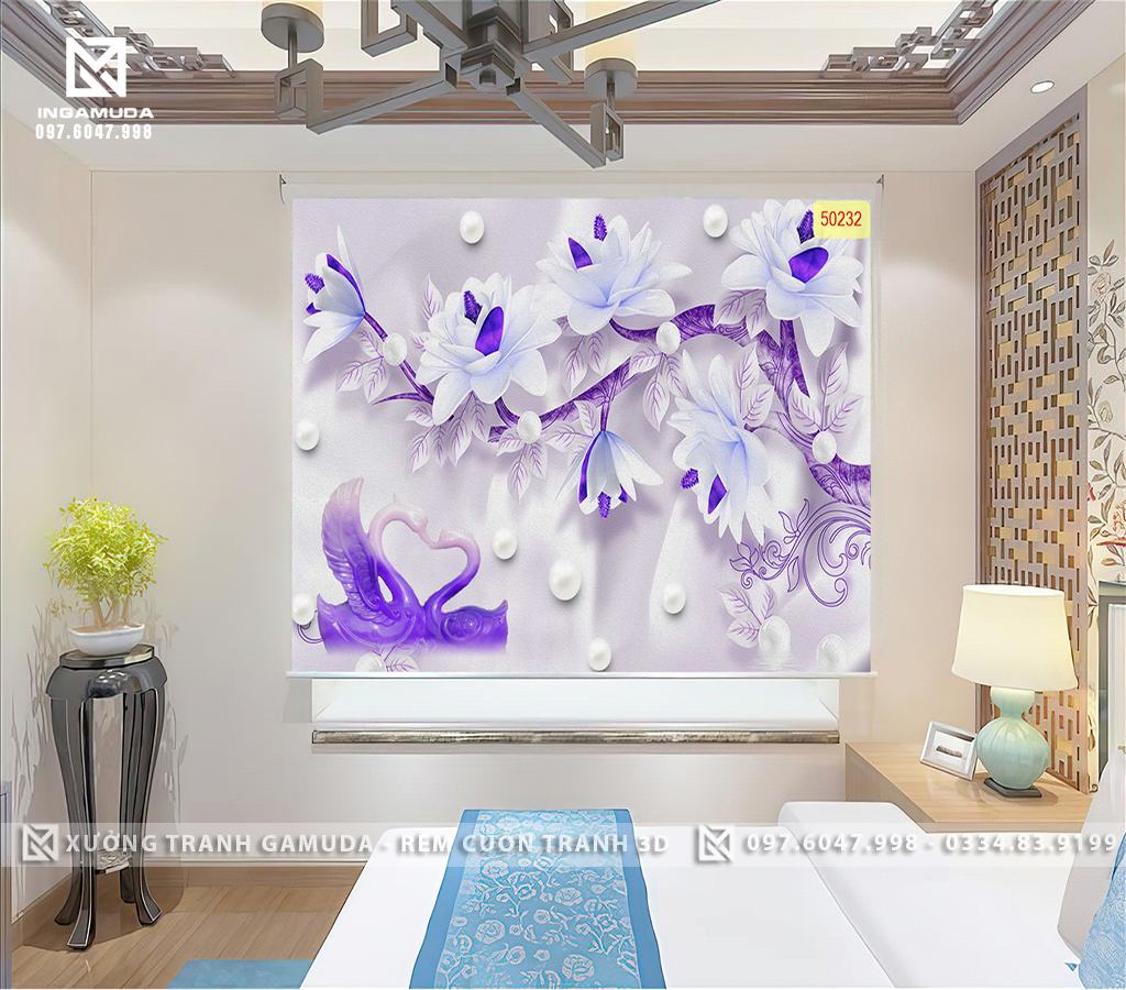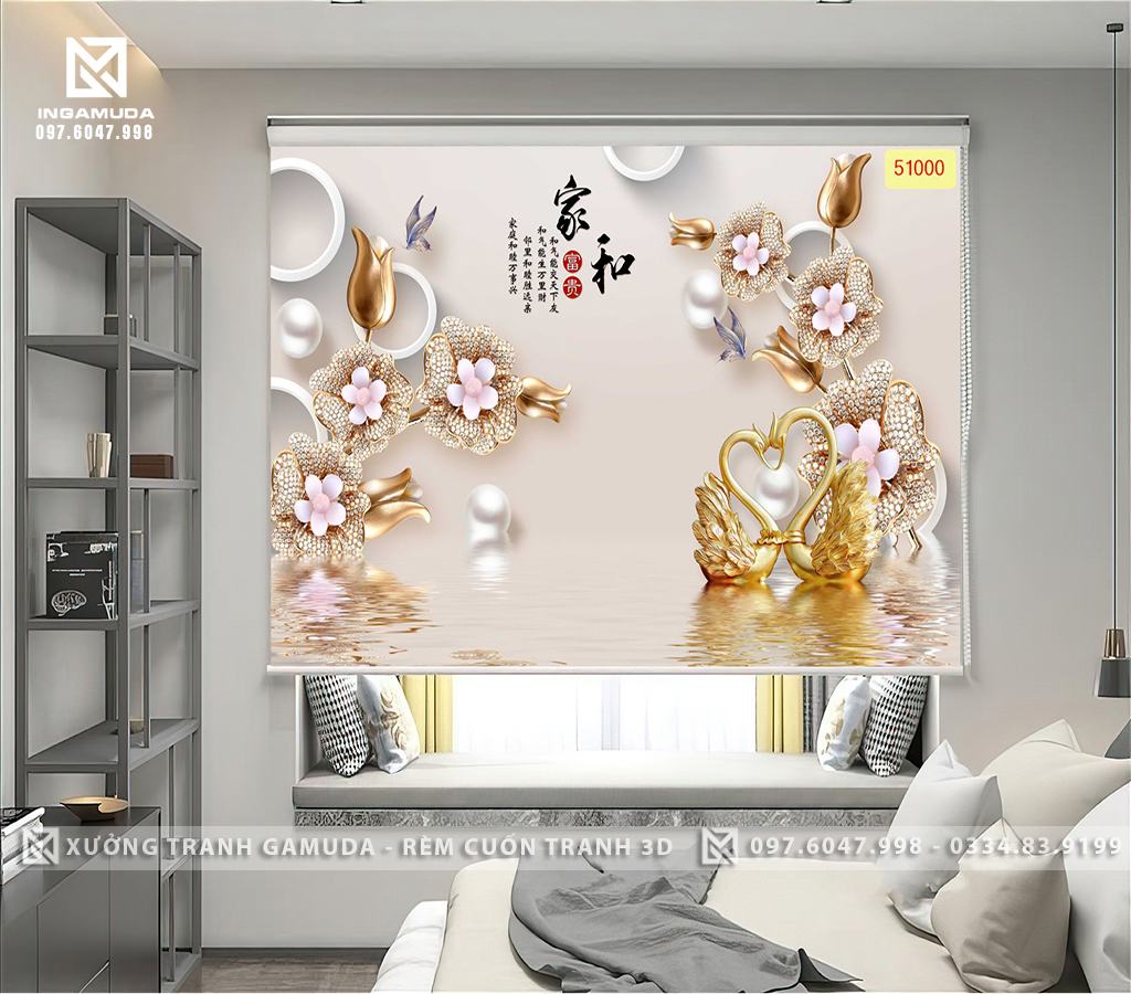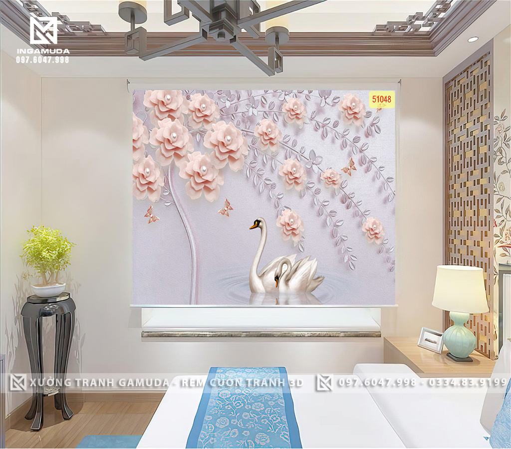 Rèm Cuốn Tranh 3D In Đôi Thiên Nga Biểu Tượng Cho Tình Yêu Và Lòng Chung Thủy