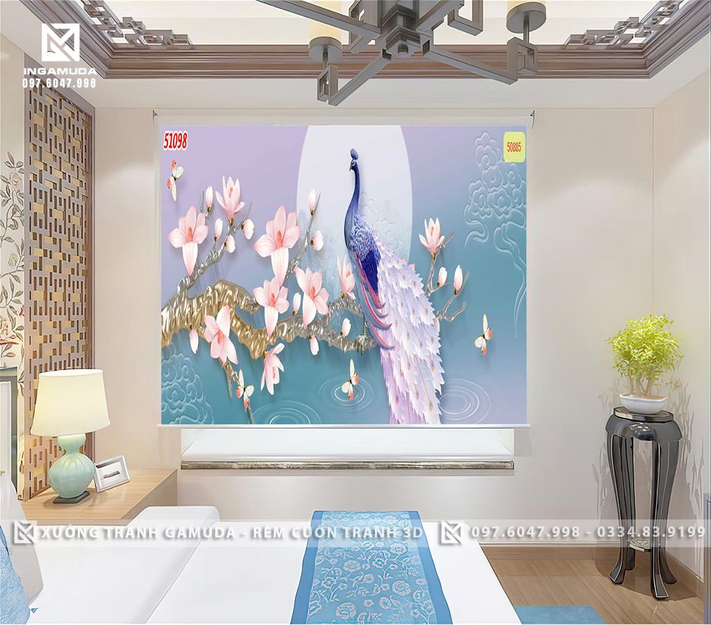 Chất Lượng Hình Ảnh Sắc Nét: Công nghệ này cho phép in ấn với độ chi tiết cao, tái tạo chính xác từng đường nét và màu sắc của chim công, làm cho rèm cuốn không chỉ là một vật dụng che chắn mà còn là một bức tranh nghệ thuật.